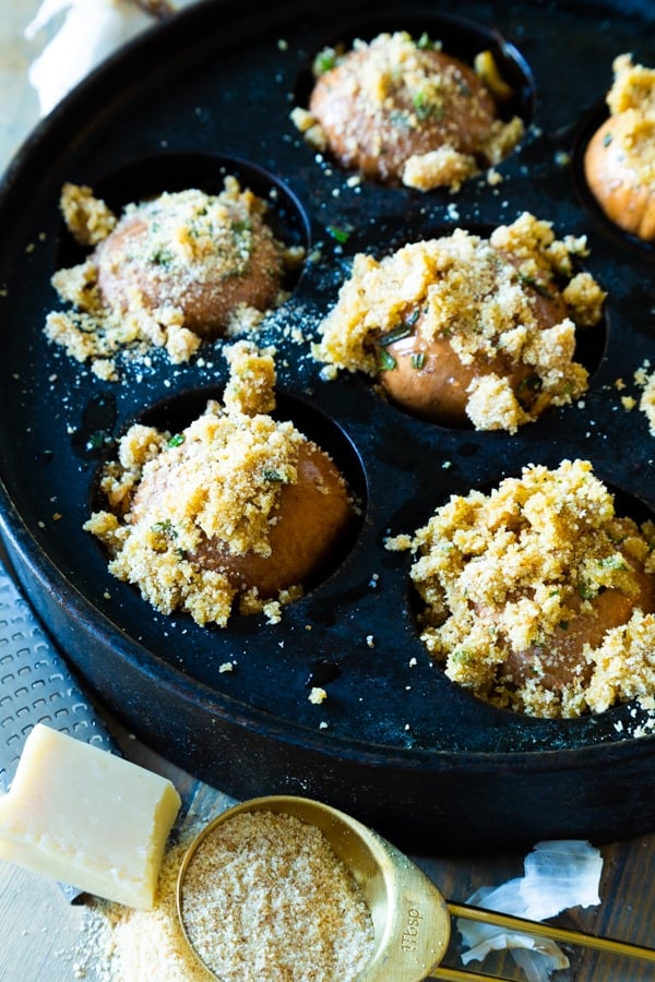 All you’ll need to do is clean the mushrooms and remove the stems. Then top with the herbed olive oil and breadcrumbs and roast.