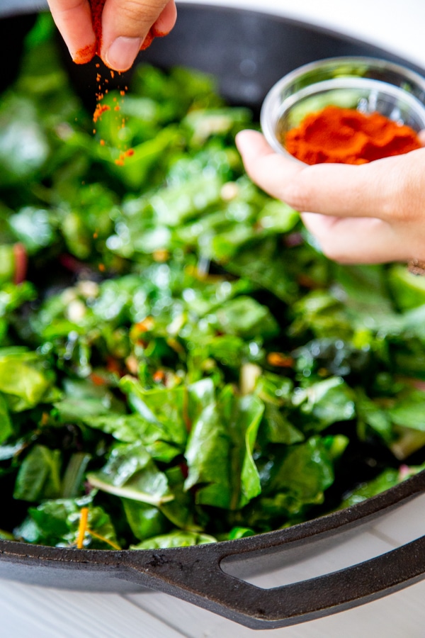 The colors in these greens are so beautiful, and when you sauté them they become so tender.