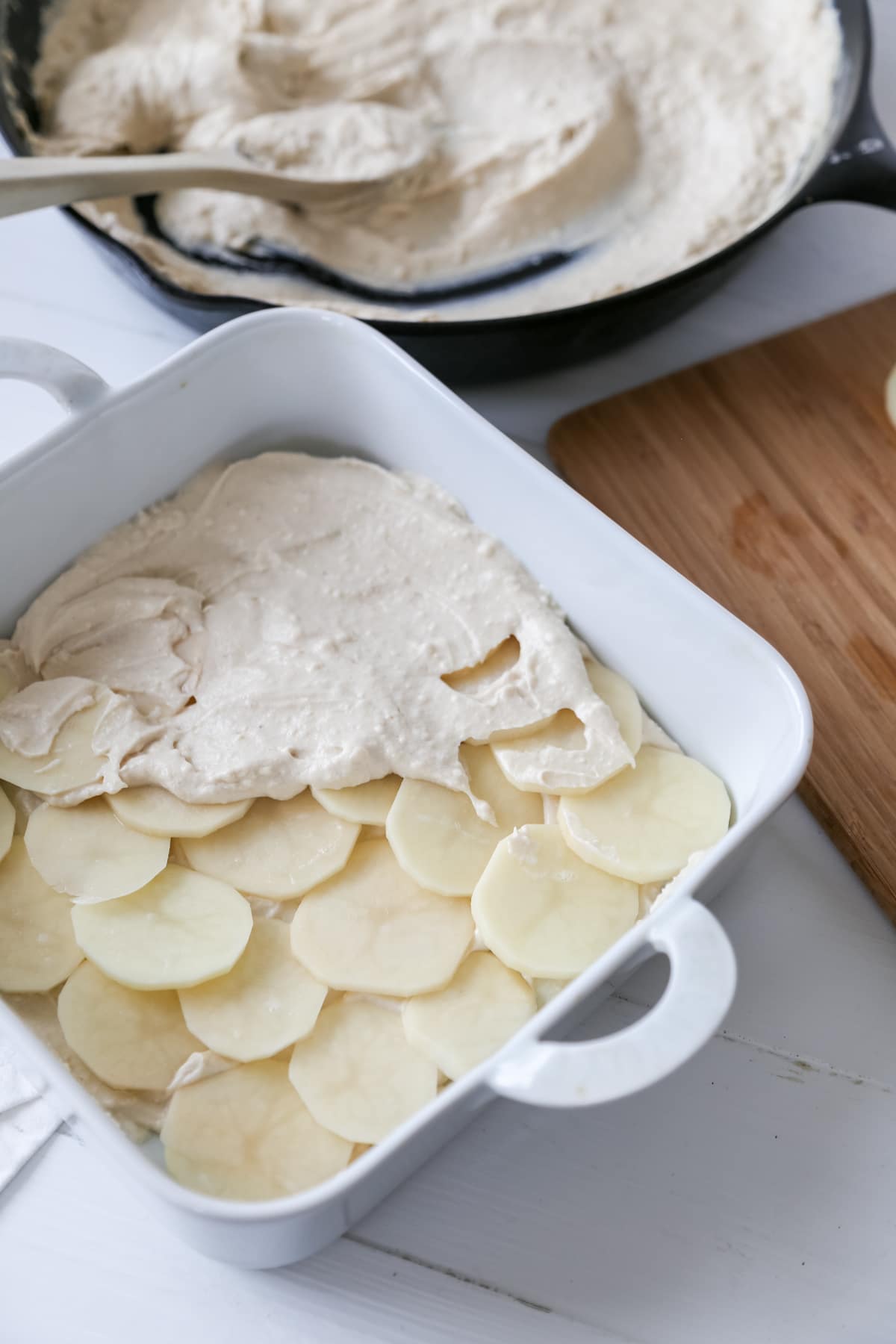 Evenly spread a layer of sauce over the potatoes and continue layering to the top of the pan or the potatoes are gone.