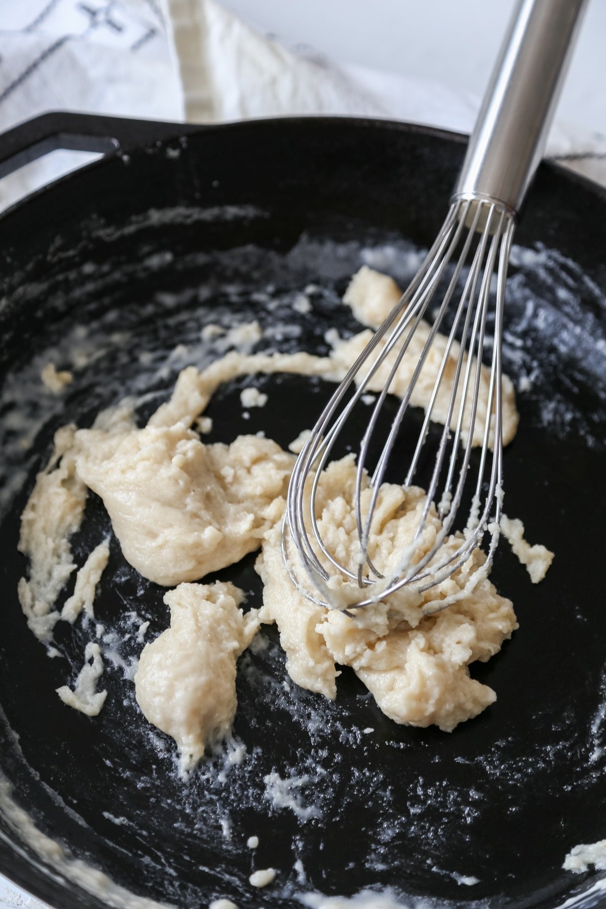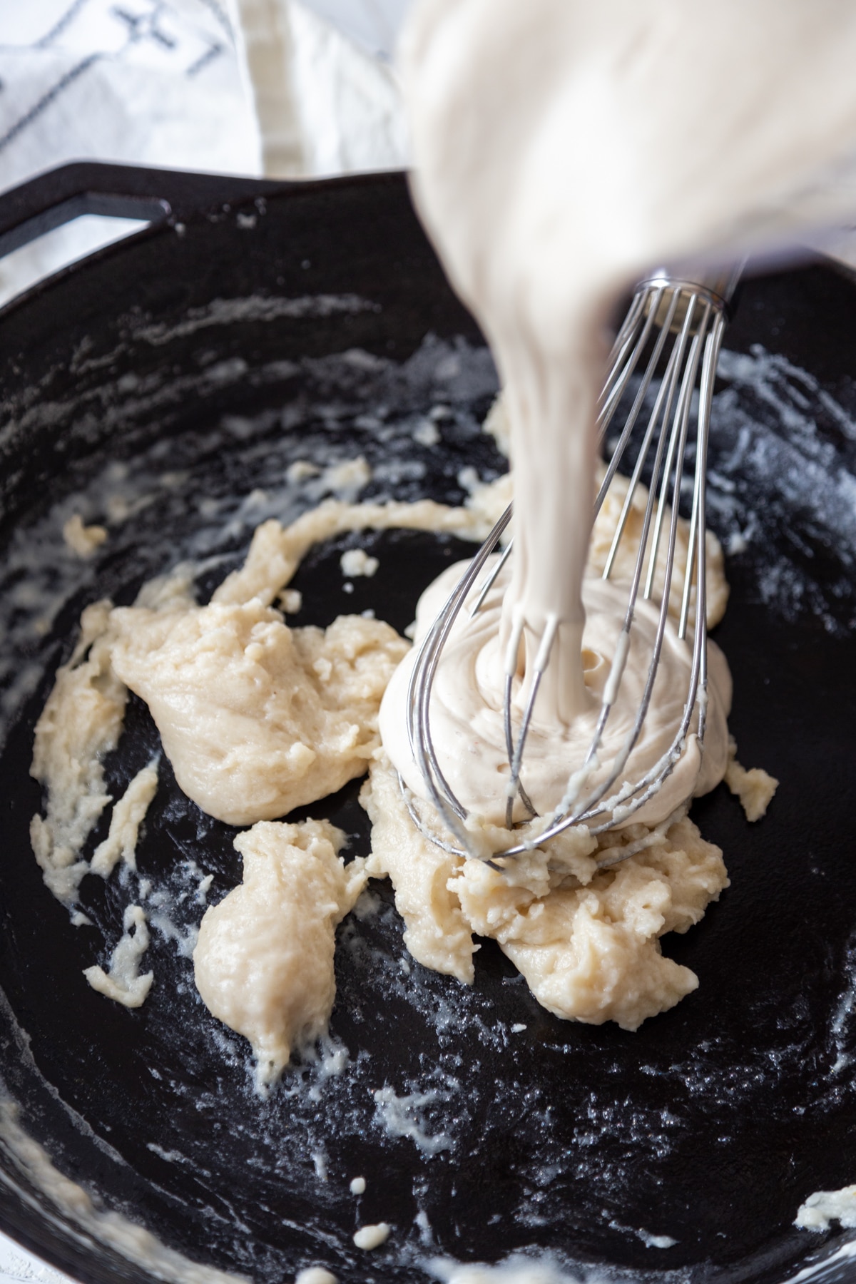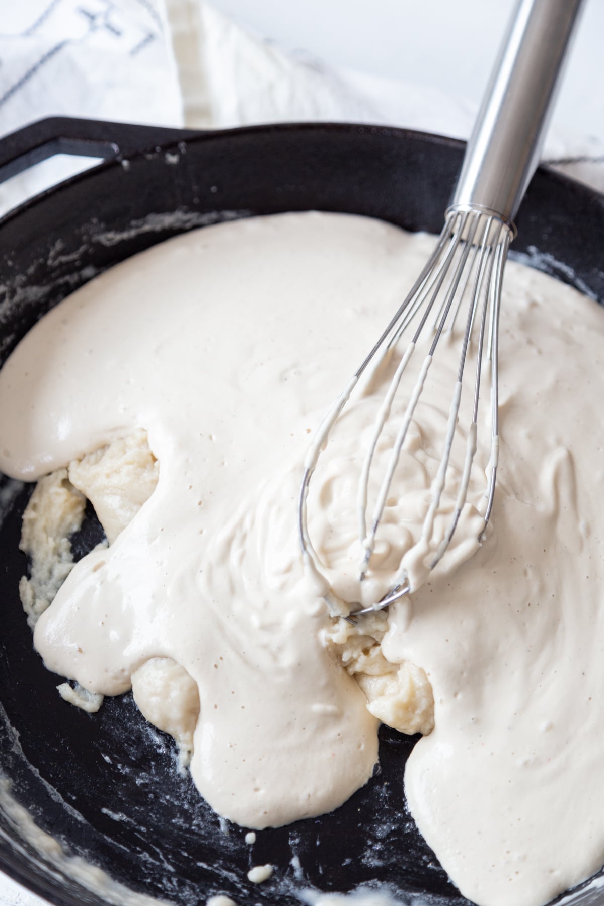 - Pour the cashew milk mixture into the pan and whisk until the roux thickens into a smooth and creamy sauce, approximately 3 minutes.