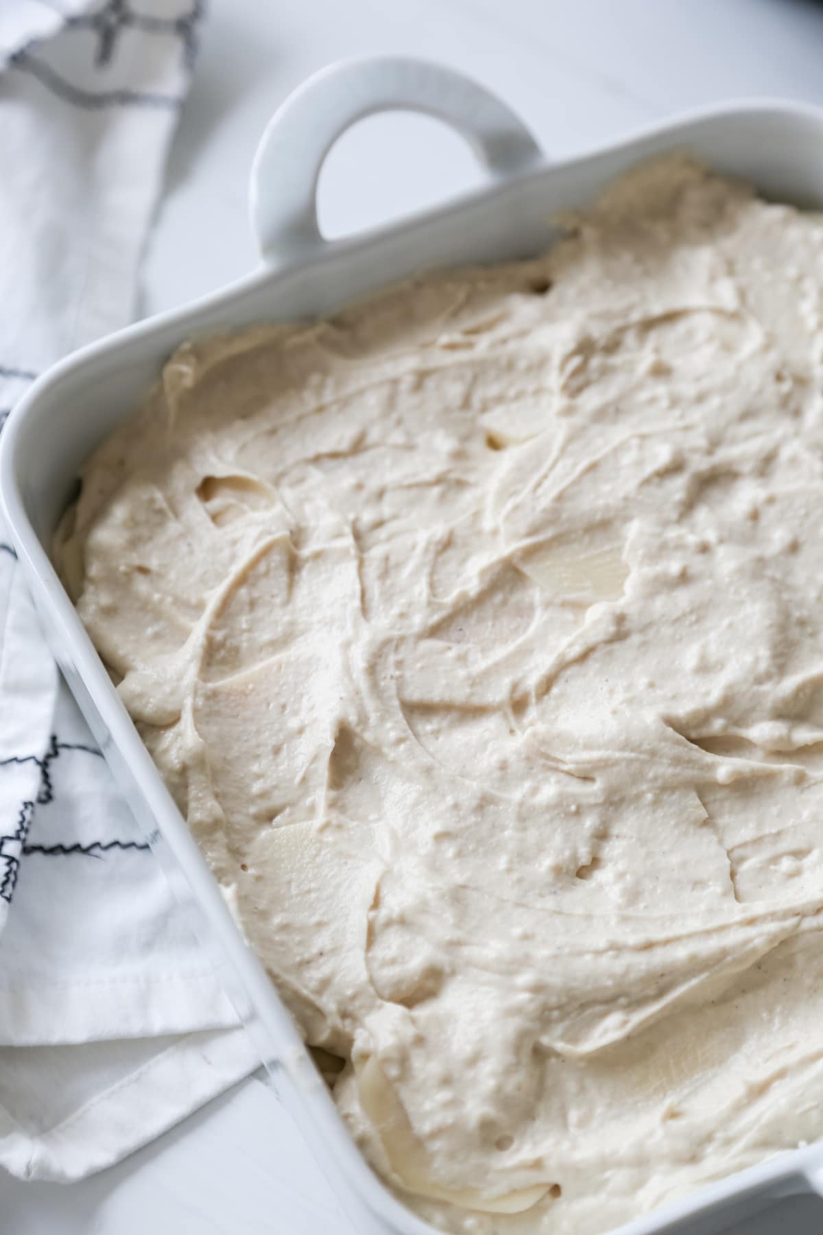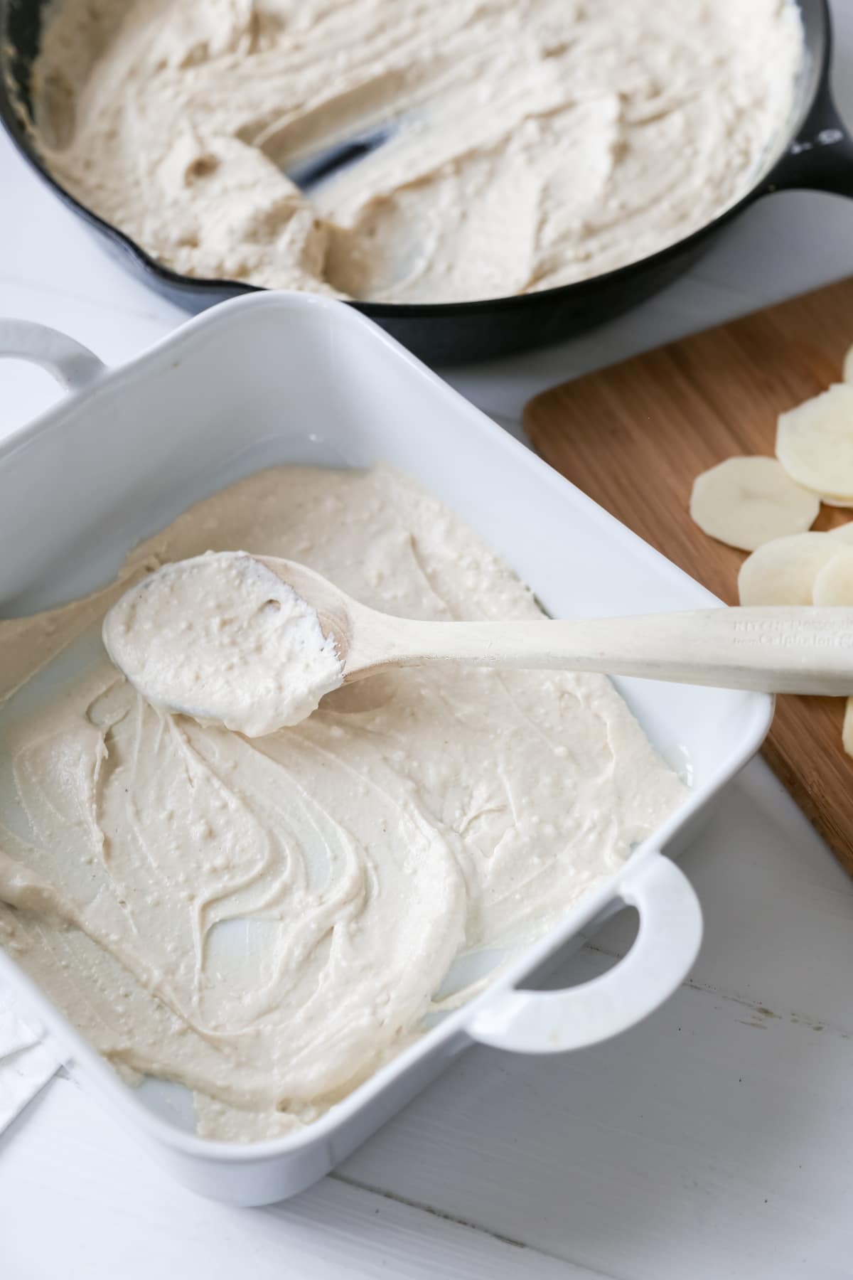 - Evenly pour a thin layer of the cashew cream into the bottom of a deep 8 x 8 inch baking dish