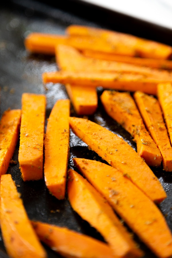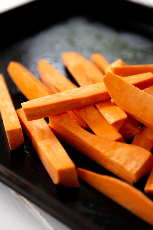 Cut the sweet potatoes into fries or wedges.