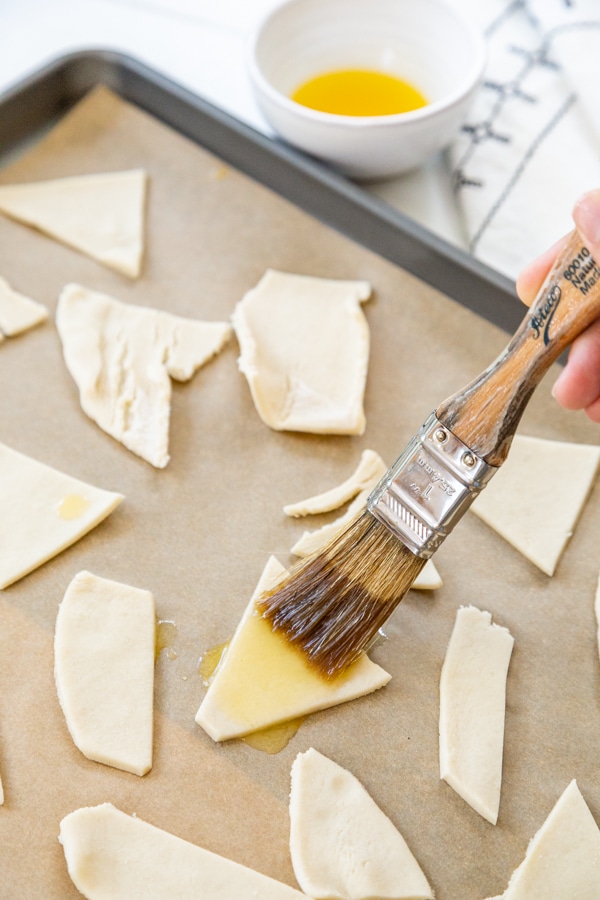 - Roll out the pie crust until it’s approximately ¼ inch thick and cut into crisps.