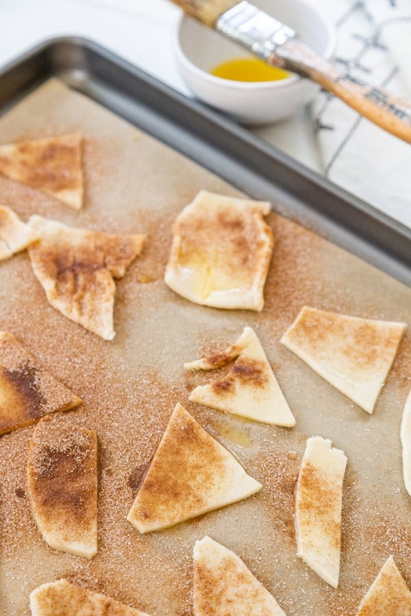Brush the chips with melted vegan butter, then sprinkle with cinnamon sugar.