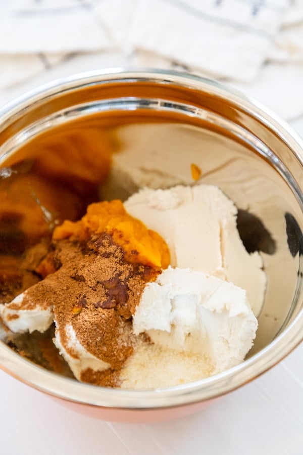 Two things that go great together are earthy pumpkin puree and tangy dairy-free cream cheese.