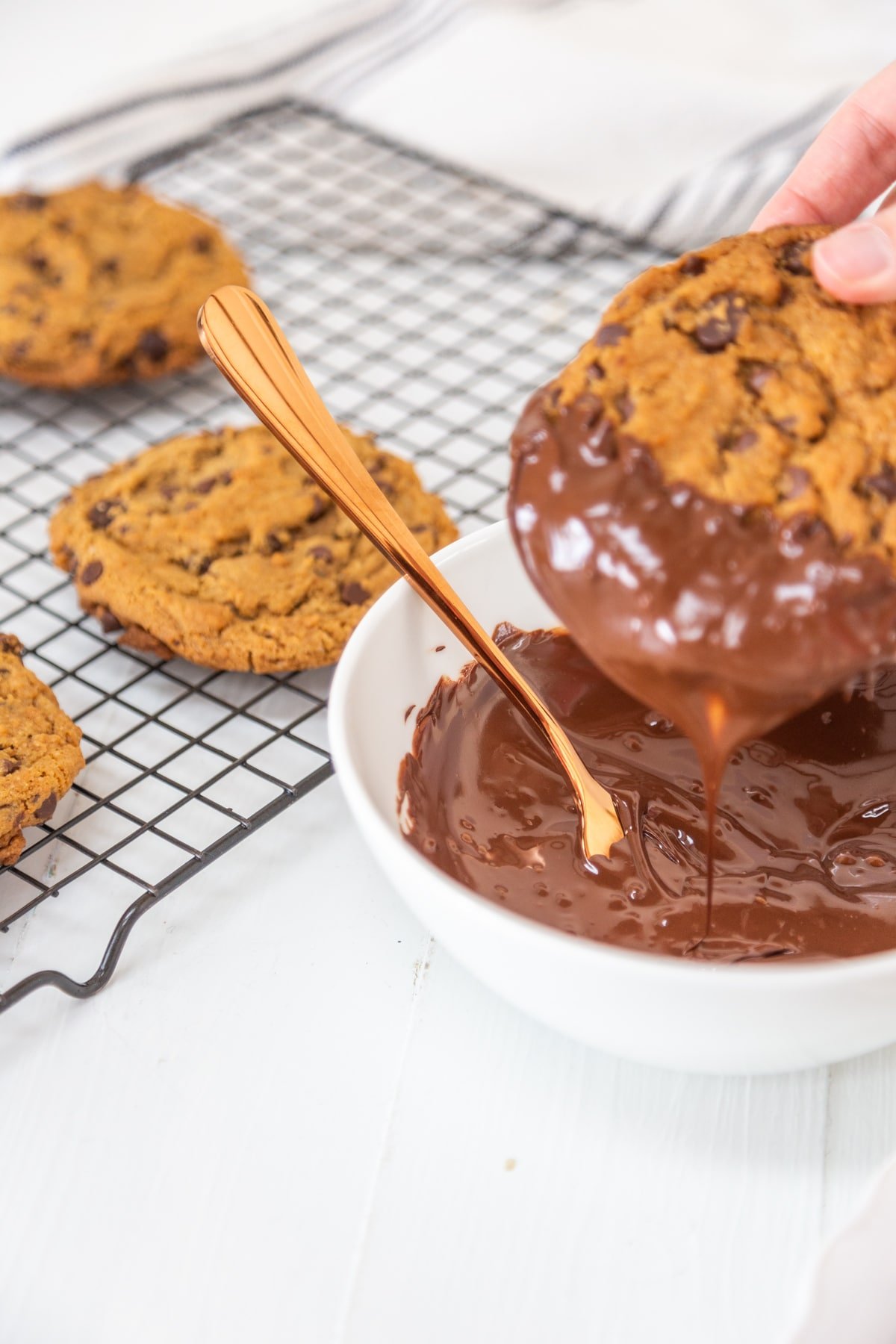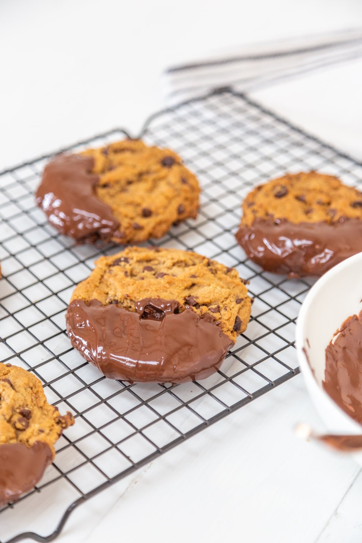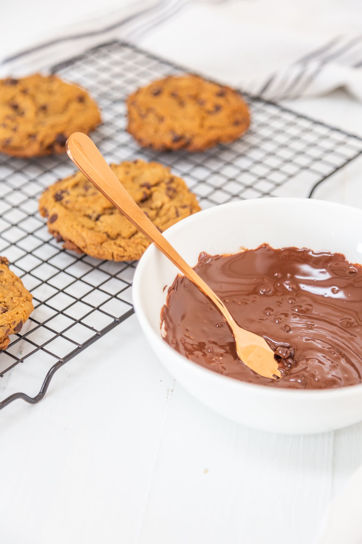 We use Enjoy Life chocolate chips in the cookies and then we melt the chips in a bowl, so we can dip half of the cookie in the chocolate.