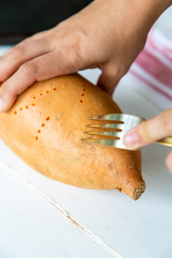 - Pat it dry and pierce the potato several times with a fork or a paring knife. This allows the steam to release from the potato so it cooks evenly and doesn’t explode while baking.