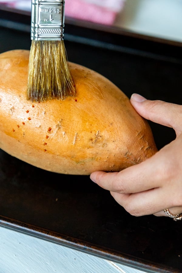 - Scrub the sweet potato clean, pat dry, pierce it with a fork or paring knife several times, and brush a light layer of olive oil on the skin (optional). Cut the potato in half and lay the flat side down on a baking sheet (use parchment paper for easy clean up. Roast for approximately 1 hour, or until the potato is fork tender and the edges are caramelized.