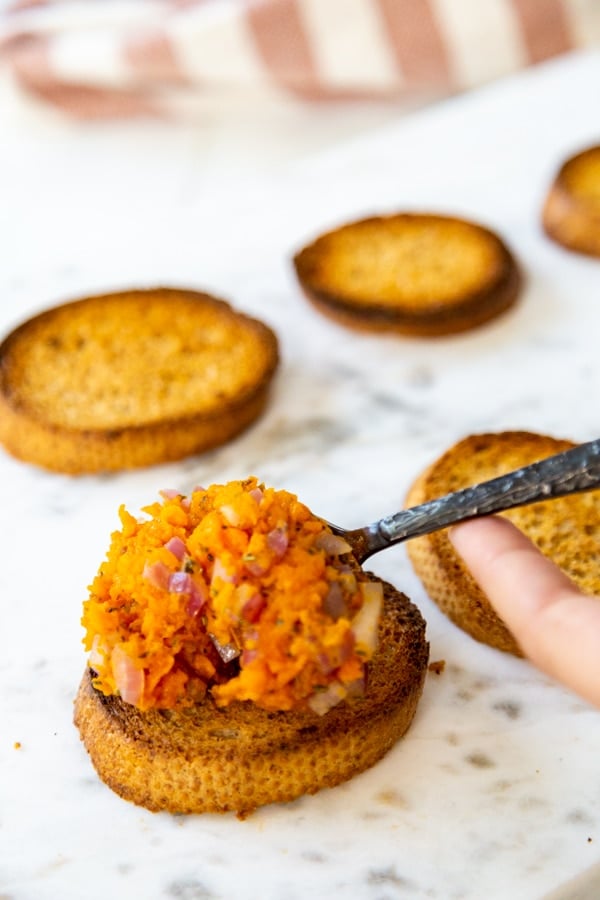 Savory Sweet Potato Bruschetta is an easy and delicious vegan appetizer that’s perfect for a simple happy hour or an elegant party. It pairs well with white or red wine. If you need two appetizers, it’s perfect with our Onion Confit Tartlets.