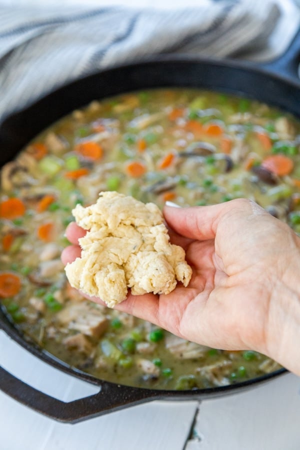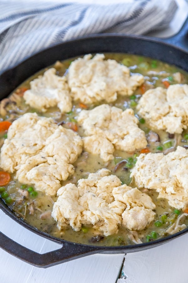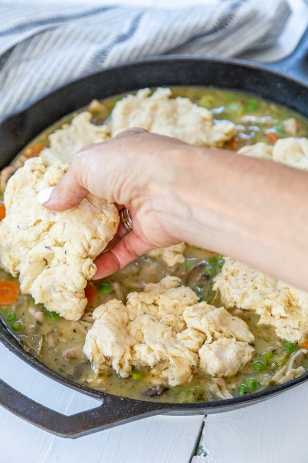 We like to make our hearty vegan chicken and dumplings stew, or biscuits in this case, in a large cast-iron skillet.
