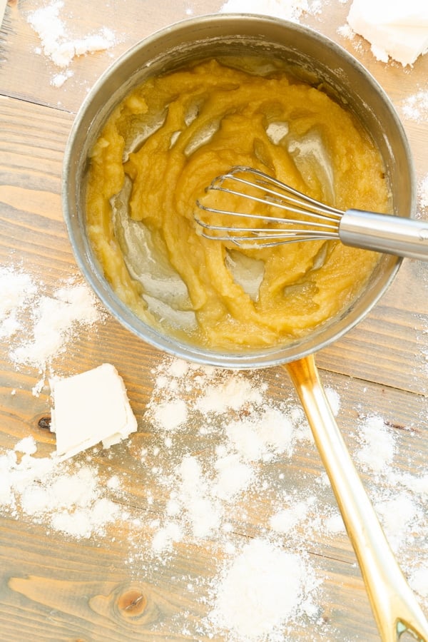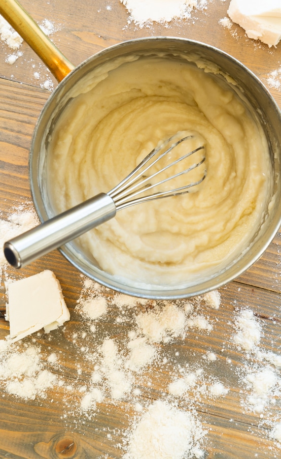 - In a small saucepan over medium heat, melt the butter. When the butter begins to bubble, whisk in the flour until it forms a thick paste.