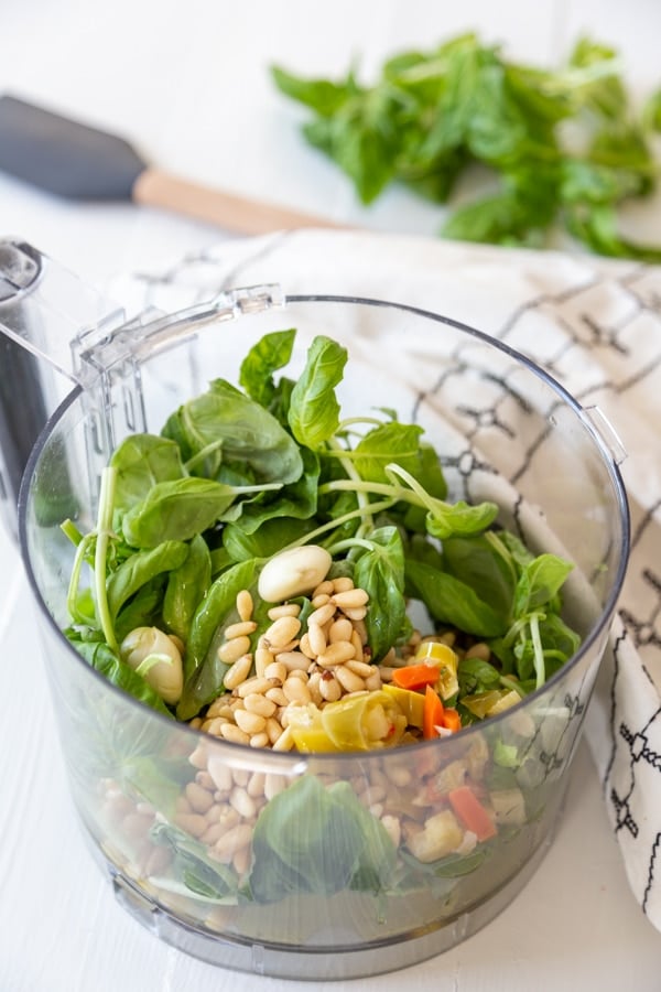 - Add the 2 cups basil leaves, ½ cup pine nuts, ½ cup vegan parmesan, chopped garlic, giardiniera (see note in ingredients), and olive oil (see note in ingredients), and salt and pepper to taste in a food processor.