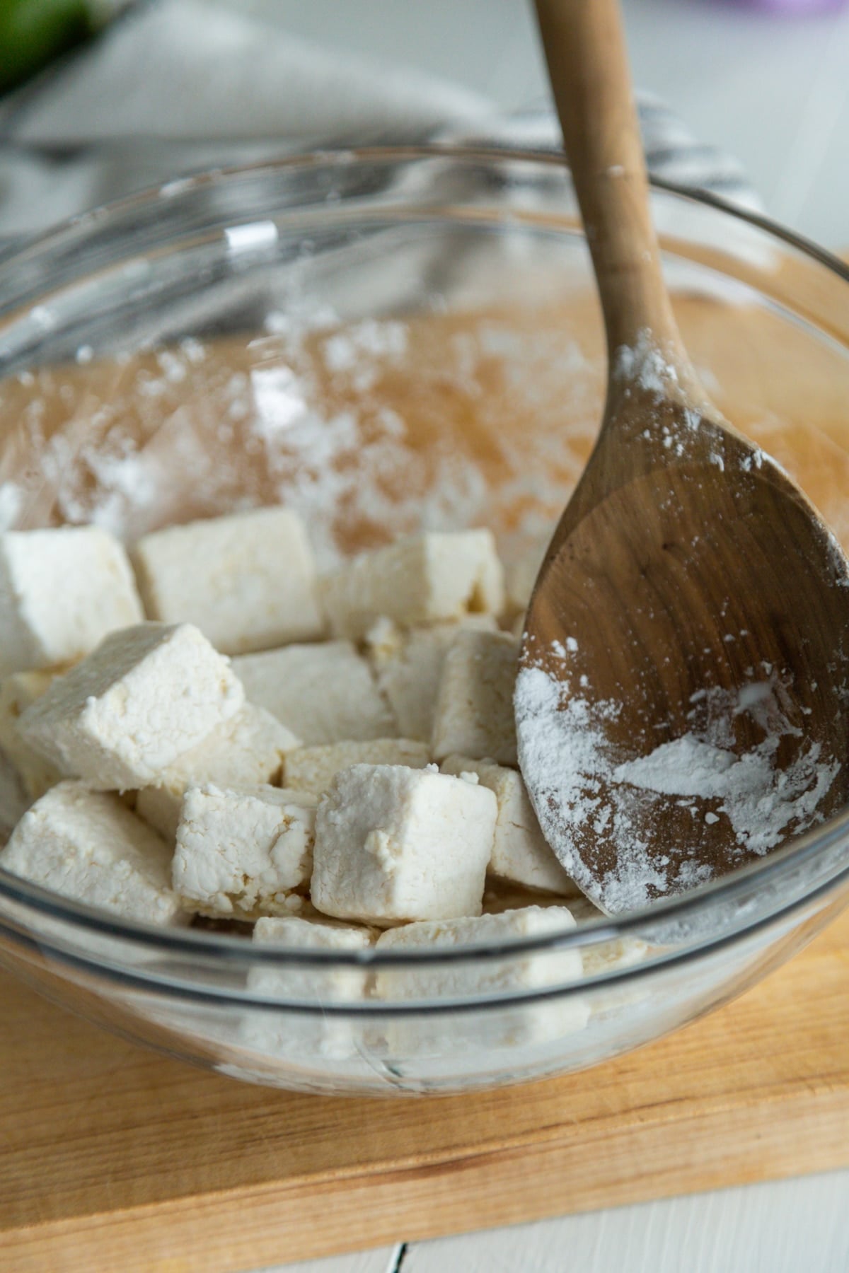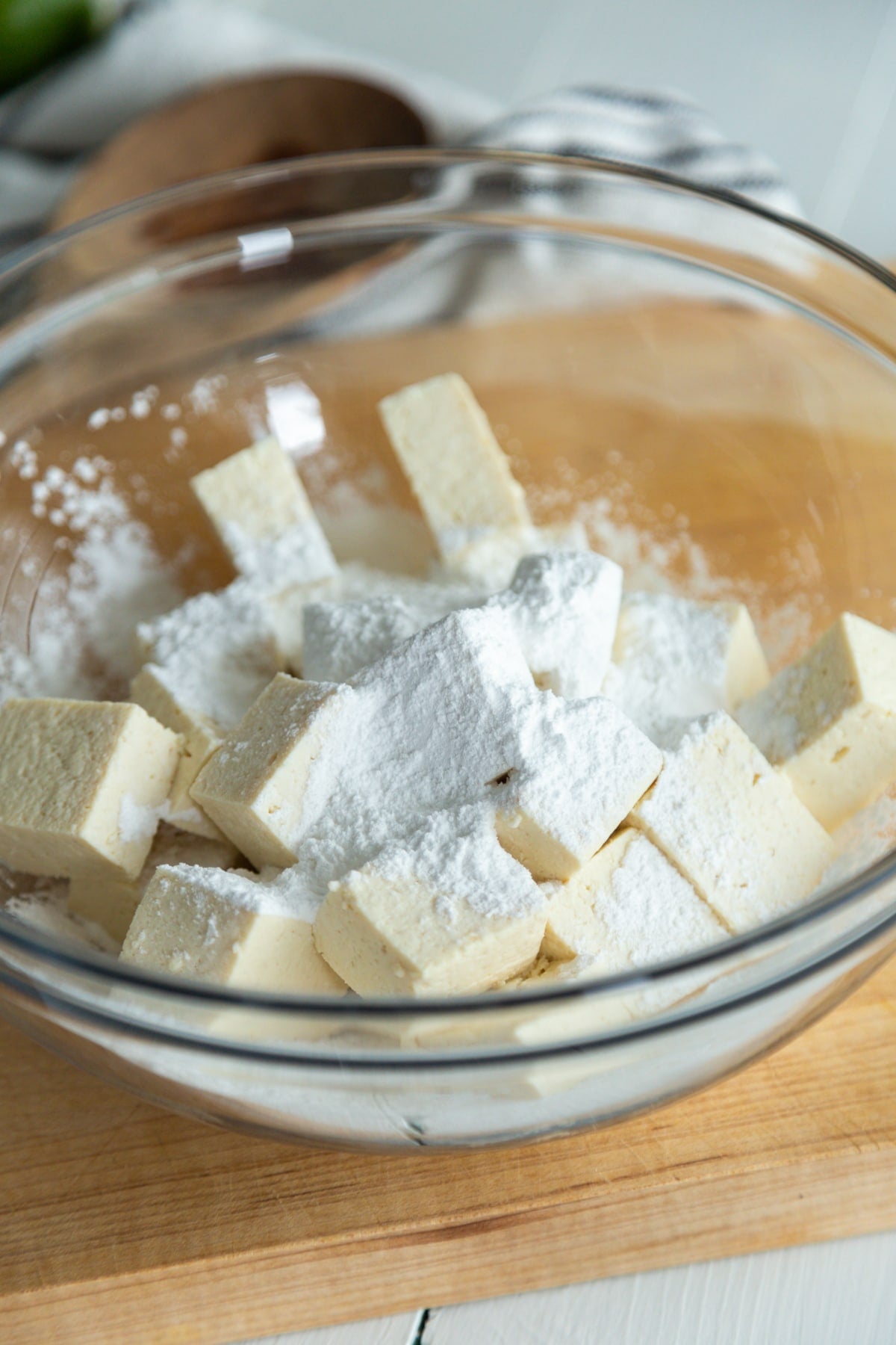 Cube the tofu into bite sized pieces and then toss it in the tapioca starch. You can also use potato or corn starch.