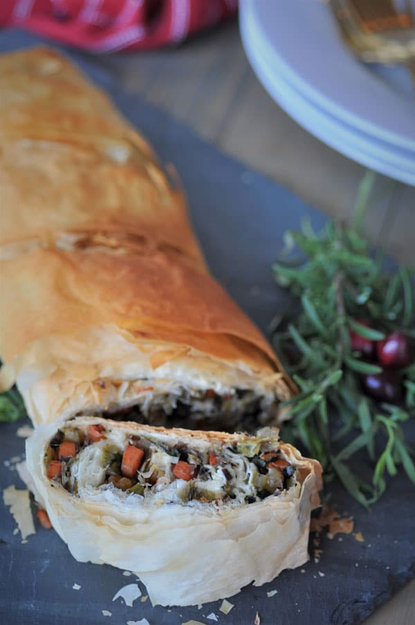 Tender and savory vegetables and herbs are wrapped up in crispy and light phyllo dough, so there is so much texture and flavor in this dish.