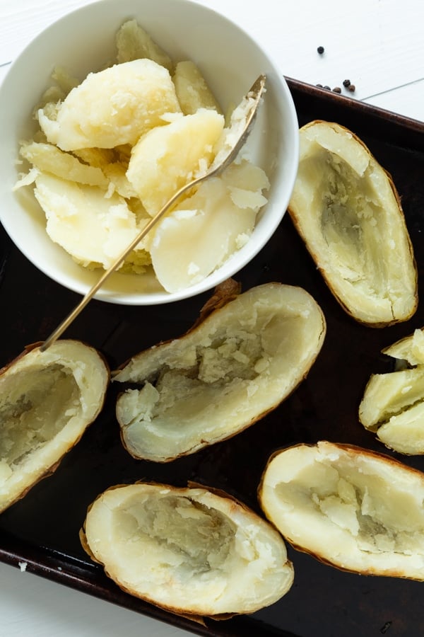 - Cut each of the potatoes in half and scoop out the center portions of the potatoes (as shown above).