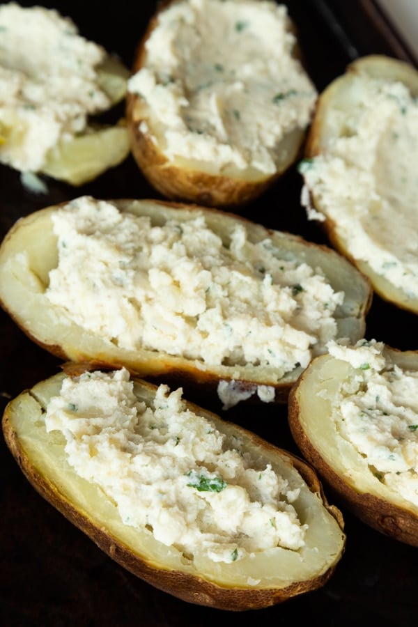 7. Pile the filling back into the potato halves and roast for another fifteen minutes.