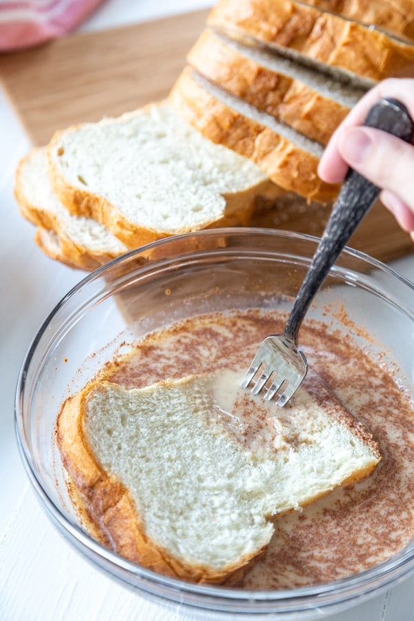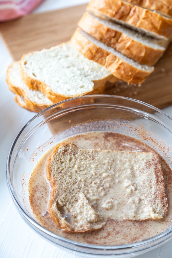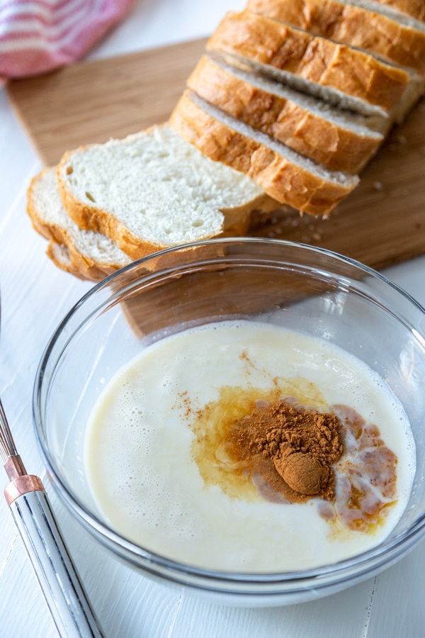 In a wide shallow bowl, whisk the vegan nog, almond milk, cinnamon, and vanilla extract until completely combined.