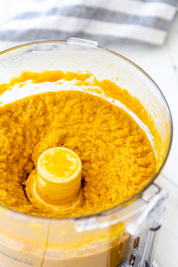 - Add the 30 oz of chickpeas and ⅓ cup melted coconut oil to a food processor and puree until smooth and creamy. There shouldn’t be any visible pieces of the chickpeas.