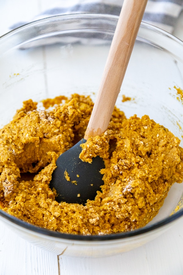 Remove the blade from the food processor and using a spatula, scrape the pumpkin mixture into the bowl with the flour.