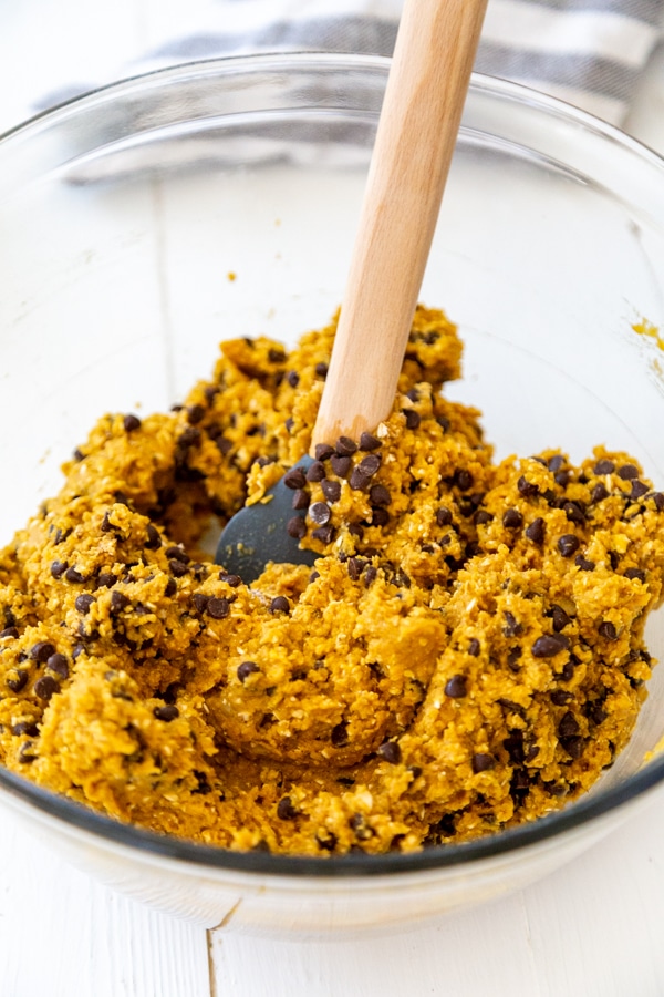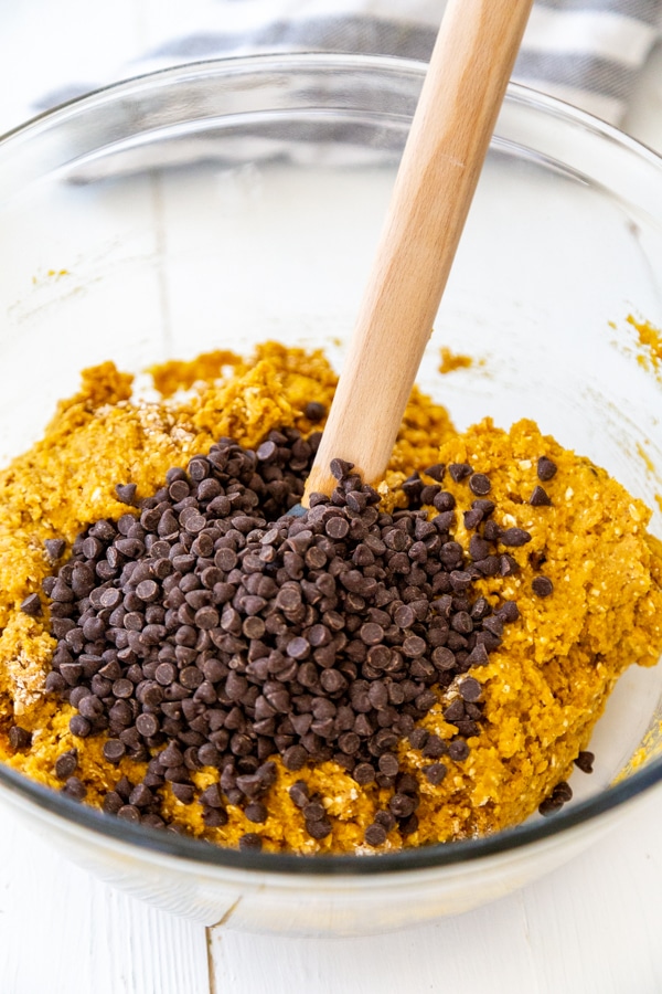 - Carefully remove the blade in the food processor and use a spatula to scrape the pumpkin mixture into the bowl with the flour. Add the chocolate chips and stir until just combined. Don’t over mix it.