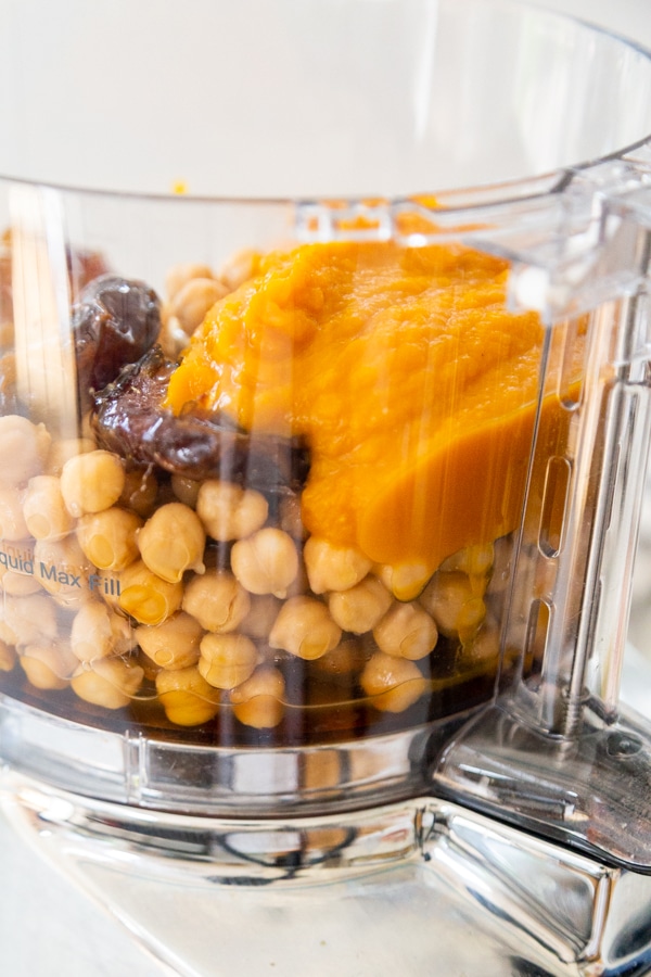 - Add the 1 cup of pumpkin puree, 4 dates (drain the water and remove pits and any hard ends), 2 teaspoon vanilla extract, and ¼ cup plus 2 tablespoon maple syrup and process until all of the ingredients are completely blended.