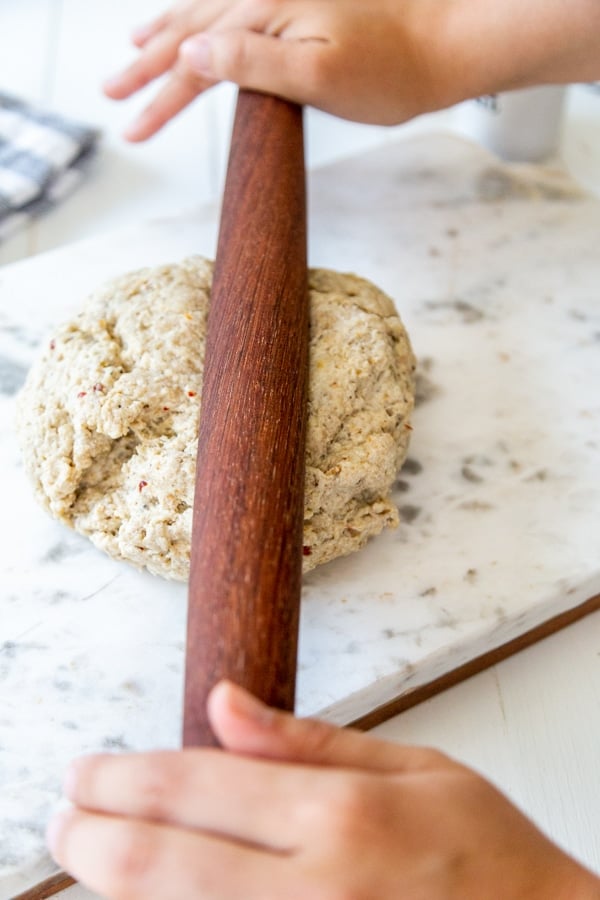 - On a clean flat surface dusted with vital wheat gluten, knead the dough for 1 minute then roll or press into a ½ inch thick circle. The dough will keep shrinking, just continue to press it back. If the dough tears, press it back together.