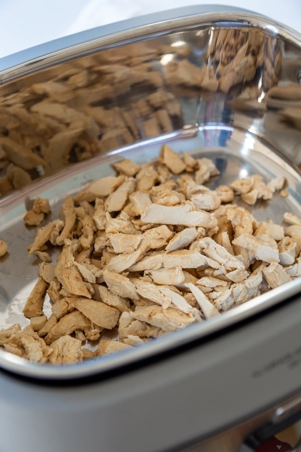 - Slice 3chicken cutlets into thin strips or use a fork and pull into shreds.
