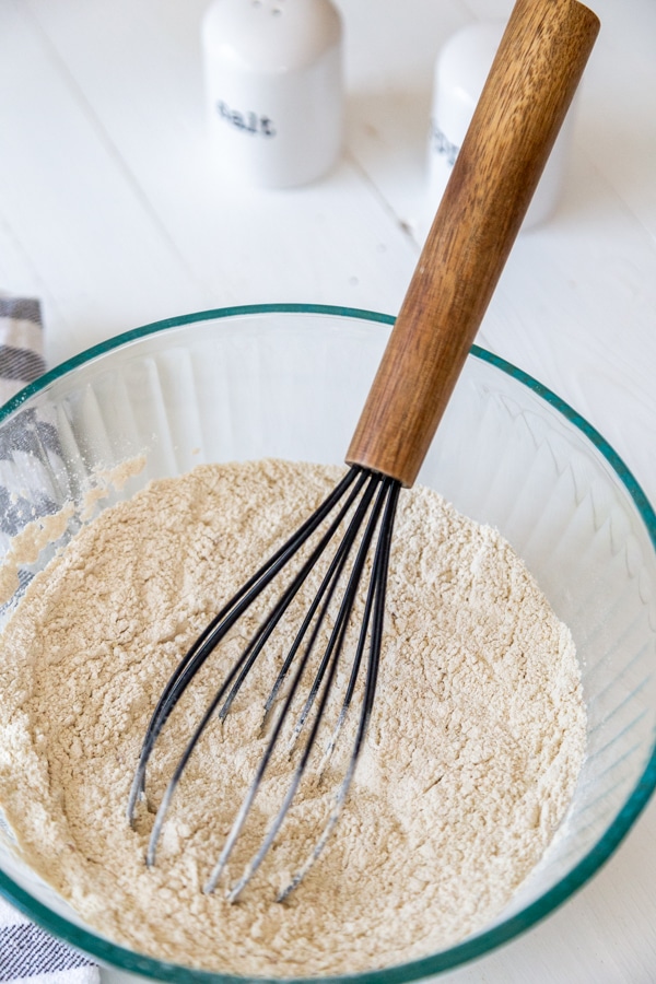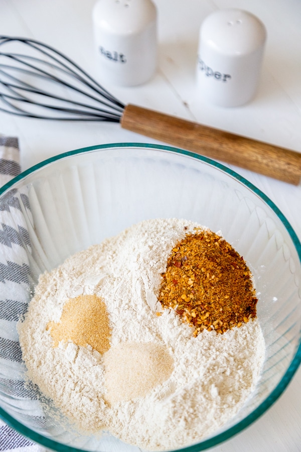 - In a large bowl, whisk the 2 cups vital wheat gluten with the 1 teaspoon garlic powder, 1 teaspoon onion powder, ½ teaspoon salt, and 1 tablespoon chicken seasoning until they’re completely combined.
