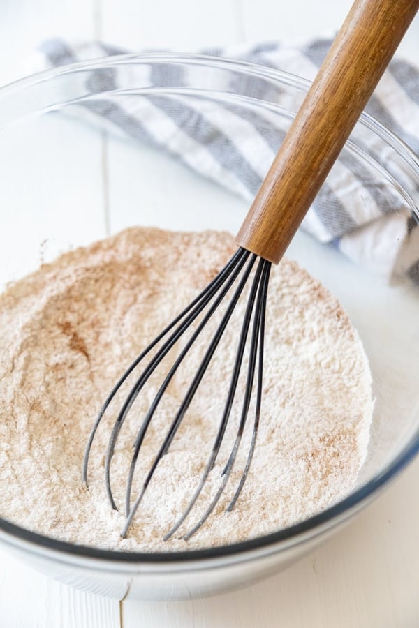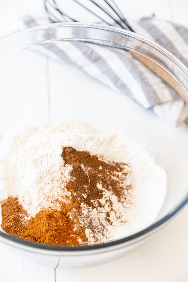 In a medium bowl whisk together the flour, baking powder, baking soda, salt, and spices until completely combined.