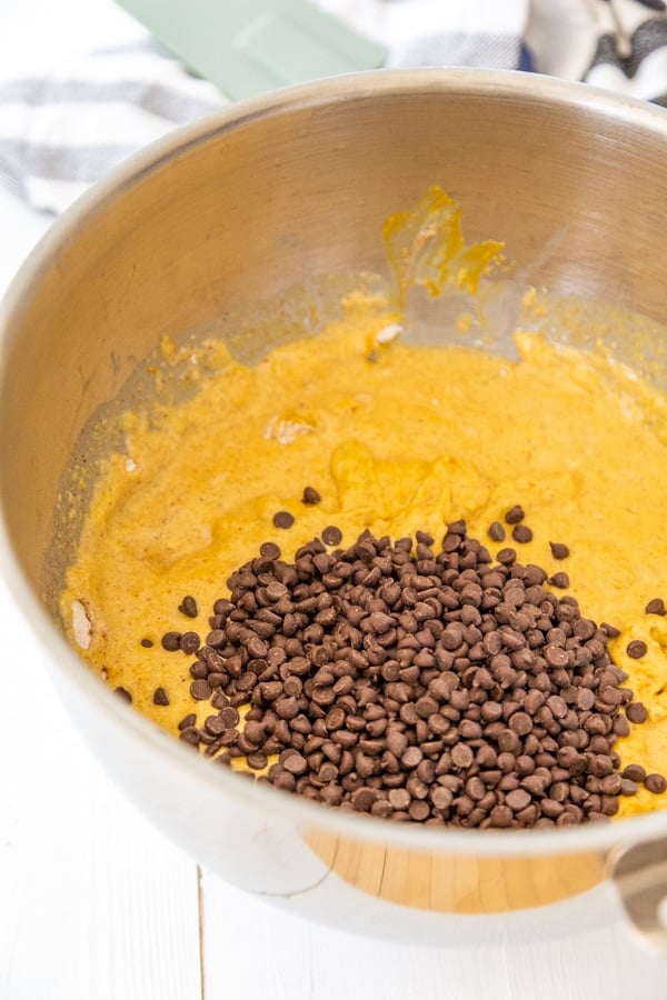 - Use a spatula to fold in the chocolate chips. A spatula will help prevent the batter from being over worked as it’s not as heavy as a spoon.