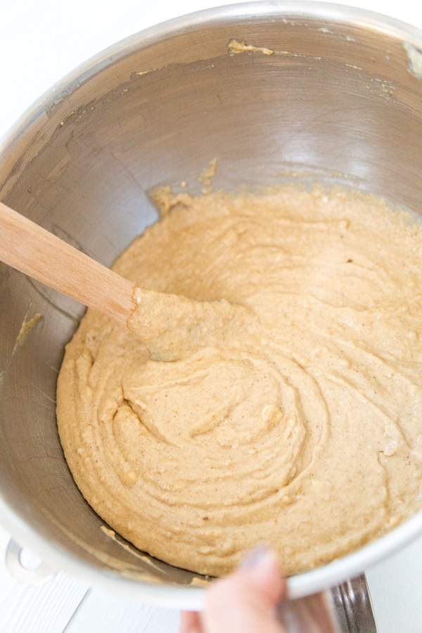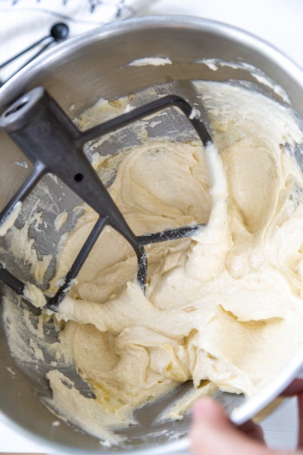- Beat the 10 tablespoon butter and 1 cup brown sugar and ½ cup granulated sugar with a whisk or paddle attachment on a high setting until it's creamy and fluffy. Add the ½ cup apple sauce and baking powder mixture and beat on a high setting until it's light and fluffy. Scrape the sides with a spatula if necessary. Add the 1 teaspoon vanilla and the 1 teaspoon molasses and beat until combined. Add one third of the flour mixture and blend until combined. Add one third of the milk and blend until combined. Continue alternating the flour and milk until it’s just combined.