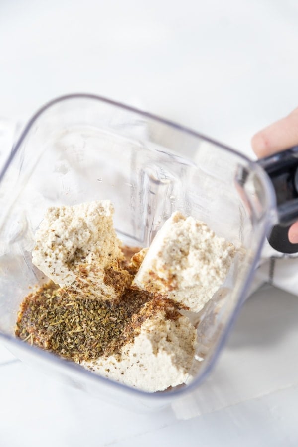 Place the tofu, flax egg, the remaining ½ teaspoon of Italian seasoning, and salt to taste in a blender or food processer and blend until it’s smooth and creamy.