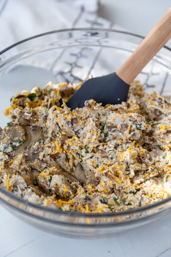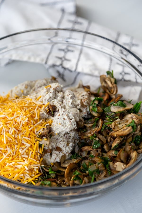 Scrape the tofu filling into a large mixing bowl and add the mushroom mixture and shredded vegan cheddar cheese and stir to evenly combine.