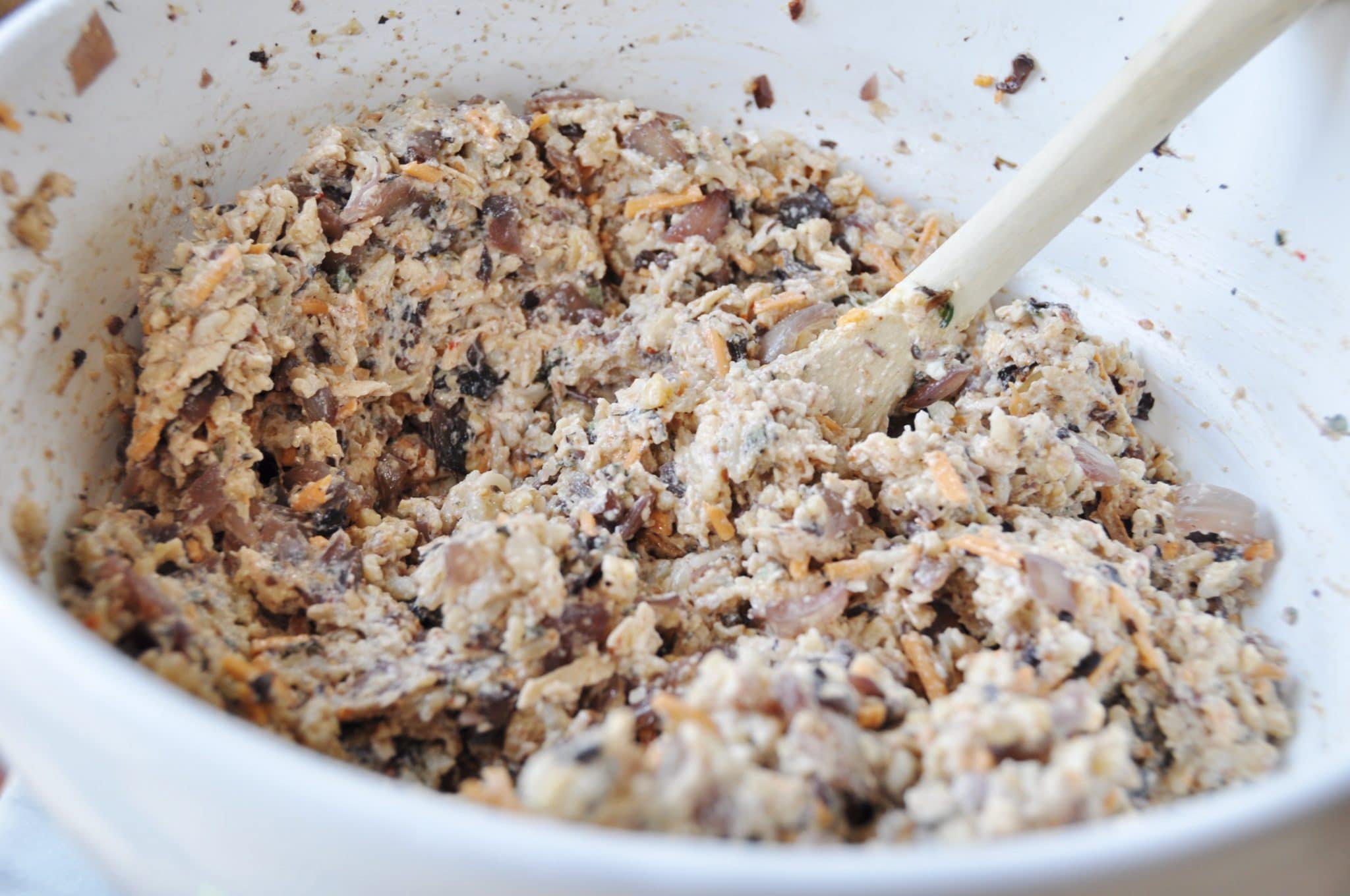 - In a large bowl, toss the brown rice and nuts together. In a separate bowl beat the flax seed mixture with the tofu. Add the flax/tofu mixture to the rice/nut mixture, then stir in the cooled mushrooms, grated vegan cheese and fresh herbs. Mix well. Taste for seasoning and adjust.
