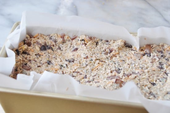 - Fill the loaf pan with the nut mixture, press the mixture with the back of a wooden spoon to smooth the top and to get rid of air bubbles.