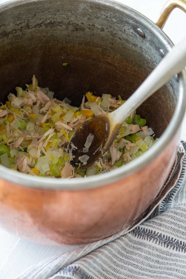 Add the no-chicken or vegetable broth and the water and stir to combine.