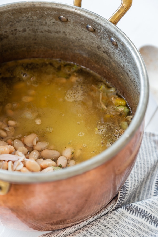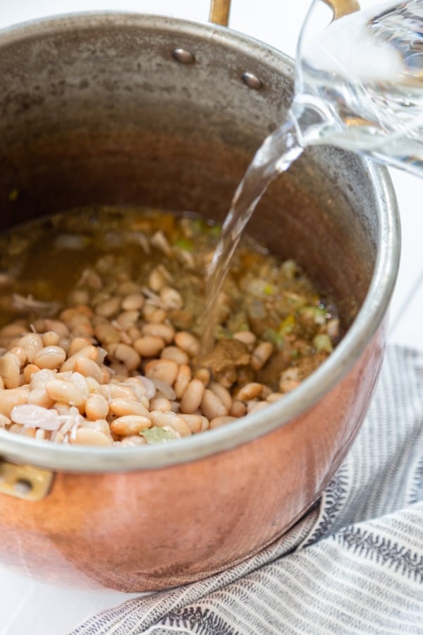 Add the sauteed veggies and beans to the crockpot with the broth and water, and cover and cook on low for 3 to 5 hours or on high for 2 to 4 hours.